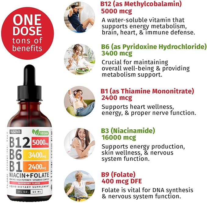 - Tons of Benefits - Experience the synergy of brain support, digestive balance, energy metabolism, heart wellness, and immune support in each drop of our Vitamin B complex liquid sublingual formula.