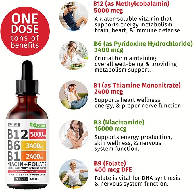 - B12 Drops Formulated for Maximum Potency - Our Liquid Vitamin B12 Drops contain Vit B12 5000mcg, B6, B1, Niacin, and Folic Acid, supporting overall body functions with 100% or more Daily Value.
