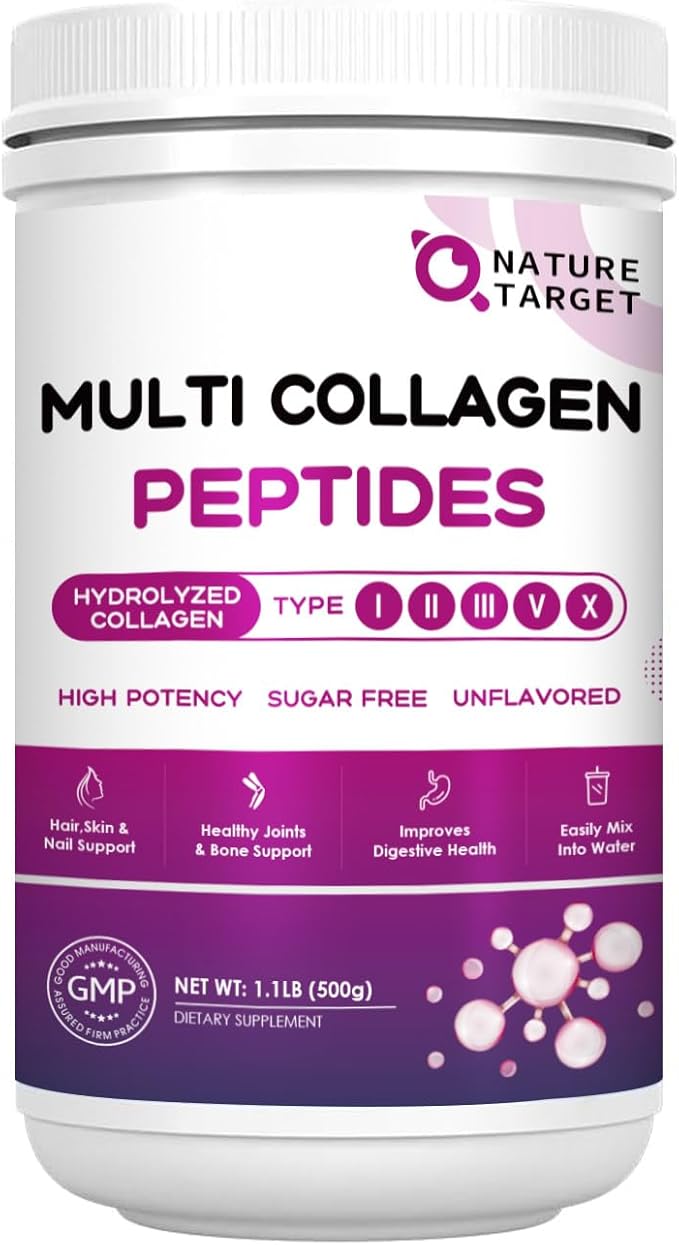 NATURE TARGET Multi Collagen Peptides Powder - Type I, II, III, V, X - Hydrolyzed Collagen Peptides with Vitamin C Hyaluronic Acid, Supports Skin Hair Nail & Joint, Grass-Fed, Non-GMO, 50 Servings