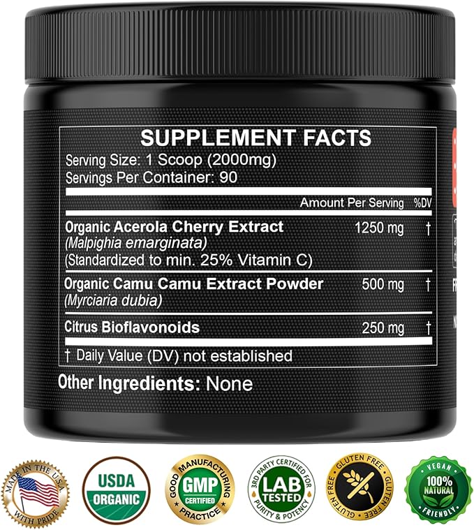 - NATURAL VITAMIN C / NO SYNTHETIC ASCORBIC ACID / NO SWEETENS ✔ We’re using Organic Camu Camu and Organic Acerola Cherries extract, which are renowned for their high vitamin C content without relying on synthetic ascorbic acid. Our Vitamin C powder has a strong, natural flavor with noticeable bitterness, which reflects its high concentration of citrus bioflavonoids. This natural taste ensures you’re getting the pure, powerful benefits of real Vitamin C just as found in nature, without anything artificial!