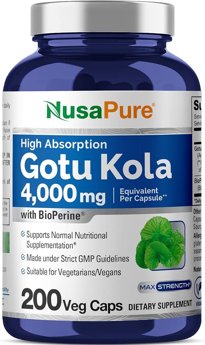 NusaPure Gotu Kola Capsules 20:1 Extract, 200 mg Equivalent to 4000mg Per Veggie Caps, 200 Count, Non-GMO, Vegan, Bioperine - Traditional Herb Extract