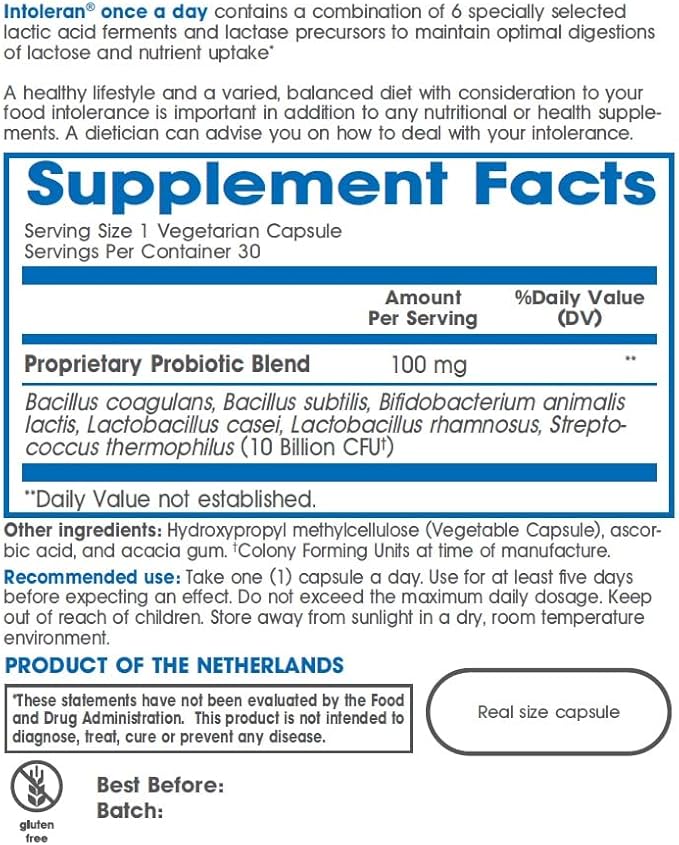 - PREVENT ABDOMINAL DISCOMFORT - Intoleran once a day contains a combination of 6 specially selected lactic acid ferments and lactase precursors to maintain optimal digestions of lactose and nutrient uptake.