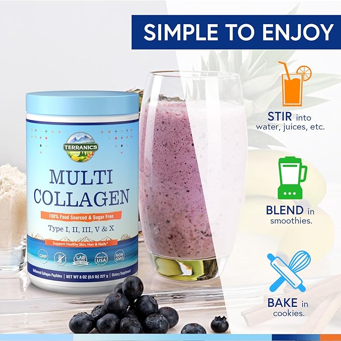 - Unflavored, Easy to Mix: Terranics Multi Collagen Peptides Powder is flavorless, odorless and easily dissolved. It is also free of sugar and low in calories, sodium & fat, making it the perfect choice to any kinds of diet including keto and paleo. Mix it into coffee, tea, smoothies, oatmeal or anything else. Our collagen is enzymatically hydrolyzed for easy digestion.