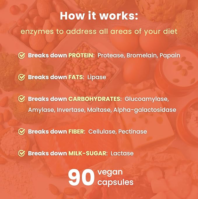 - Combat Bloating & Discomfort - With over 10 essential enzymes, including Amylase, Lipase, and Protease, to ensure thorough digestive support across all food groups - dairy, fats, proteins, carbs, and fiber. It’s time to eliminate meal time discomfort!