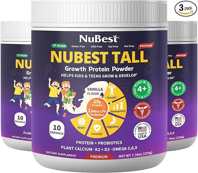 NuBest Tall Protein Powder for Kids & Teens - Vegan Vanilla Protein Powder Shake with Organic Red Algae Calcium, Probiotics, Omega 3-6-9, Vitamin D3 + K2 & Magnesium from Marine Algae - Pack 3