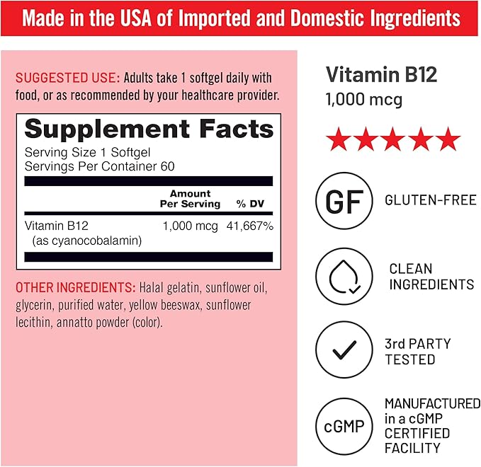 - ENERGY METABOLISM SUPPORT: Every easy-to-swallow softgel delivers 1000 mcg of Vitamin B12 to support the production of cellular energy and help convert food into energy.*