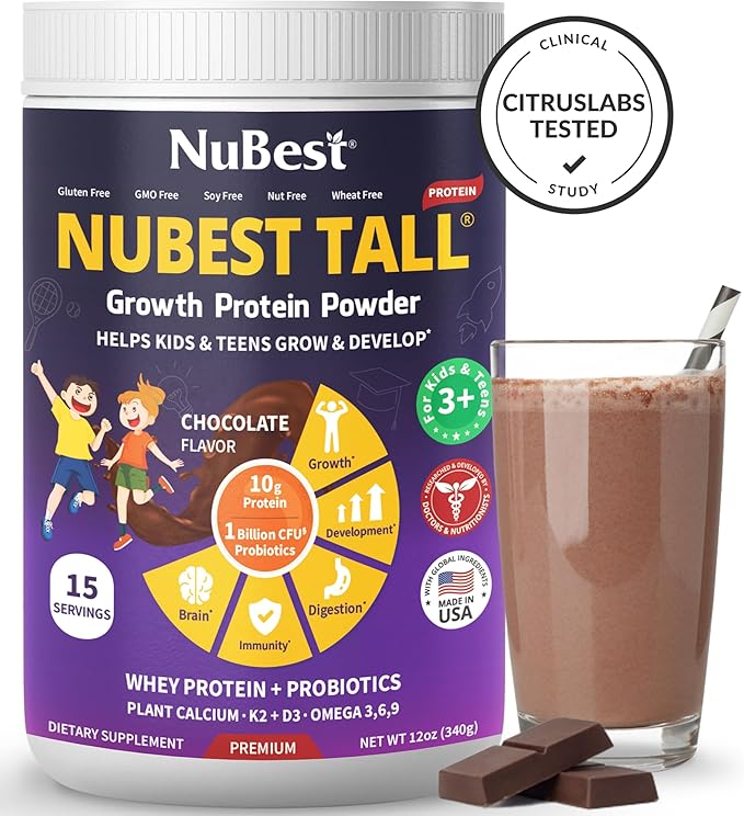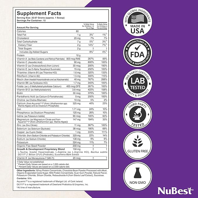 - Nutritional Shake: Our powder is convenient and easy to enjoy; perfect for breakfast, before & after school, on-the-go meals, or at any time of the day to kickstart your children’s energy and fuel their active days. The new formula with Red Algae Organic Calcium, Magnesium from Marine Algae, Vitamins, Minerals, Omega 3-6-9, and Probiotics in NuBest Protein Powder will help support overall health, bone strength, and immunity. This innovative blend is the perfect combination for kids & teens' overall health, brain development, and immune system.