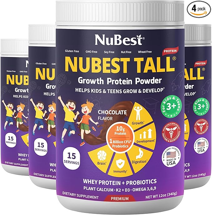 NuBest Tall Protein Powder for Kids & Teens - Chocolate Protein Powder Shake - Protein Drink with Probiotics, Omega 3-6-9, Vitamin D3 + K2, Calcium, Vitamins - Bone Strength and Immunity - Pack 4