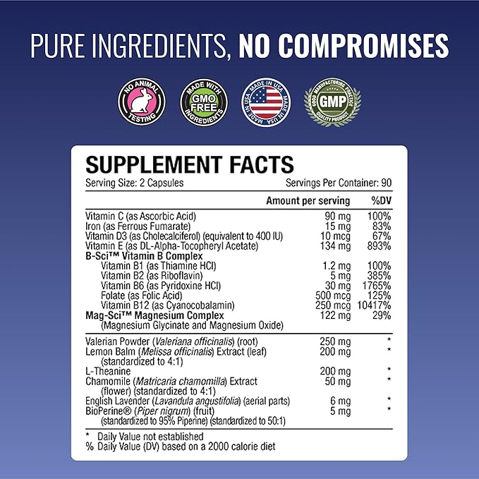 - Rest Response - Contains Chamomile, Valerian, and Lemon Balm, plus 200mg L-Theanine.
