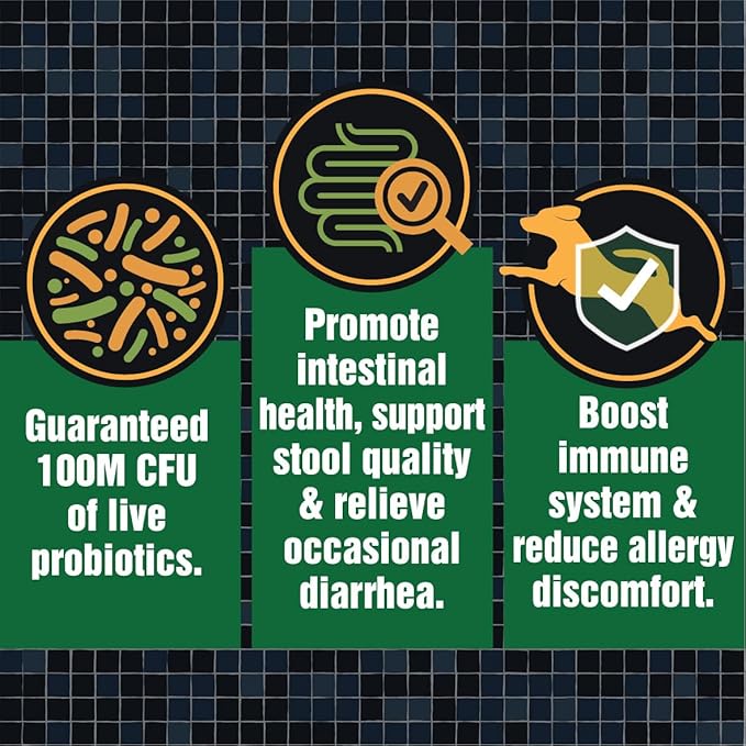- Improve Digestive Health & Occasional Diarrhea: Formulated with 100M CFU of potent probiotics & digestive enzymes, it helps balance your dog's gut microbiome, improving digestion and regulate bowel movements for perfect poop. Ideal for dogs with sensitive stomachs, this supplement promotes a healthier digestive system and manage occasional dog diarrhea.