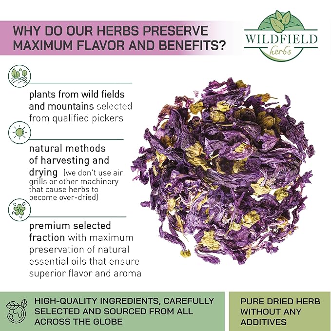 - Our Mallow Herb, whole, processed under hygienic conditions. Pure, high quality Malva loose flowers with a strong aromatic effect. The packaging is hand-sealed and hermetically sealed to ensure freshness.
