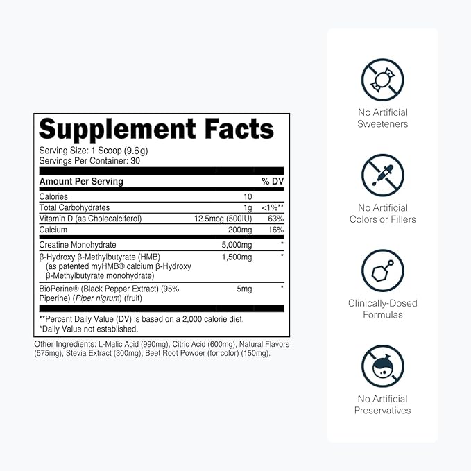 - Enhanced Strength and Power: Studies have shown that taking creatine HMB results in significantly higher lean body mass and strength gains compared to creatine monohydrate alone. The synergistic combination of creatine monohydrate and HMB in our formula lets you push harder during workouts and achieve greater gains.