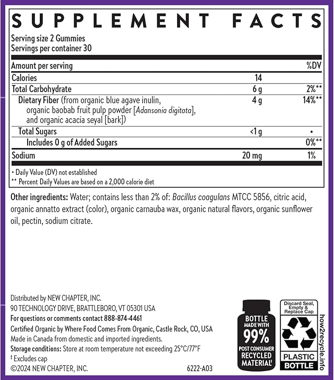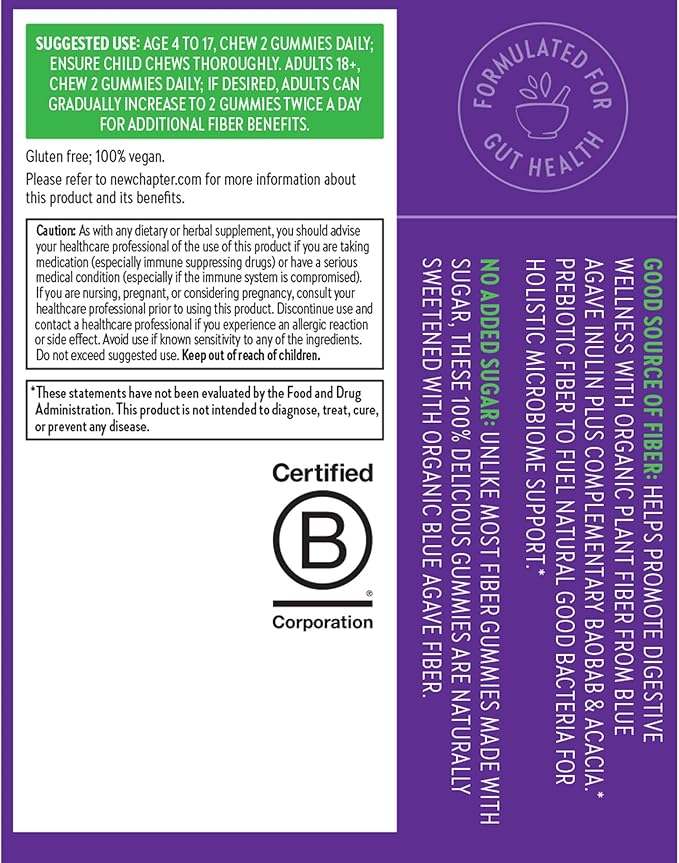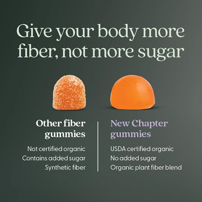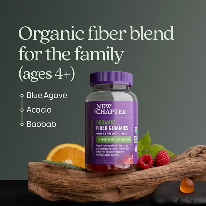 New Chapter Organic Fiber Gummies for Adults & Kids (Age 4+), Plant-Based Prebiotic Fiber for Digestive Health, Vegan, Non-GMO, USDA Organic, Gluten Free, Citrus-Berry Flavored, 60 ct