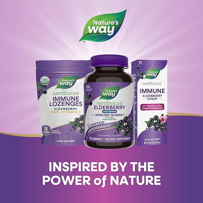 Nature's Way Sambucus Zero Sugar Immune Gummies, Daily Immune Support*, Black Elderberry Extract, Vitamin C, Vitamin D3, Zinc, Sugar Free, Sugar Alcohol Free, Plant-Based Sweeteners, 70 Gummies