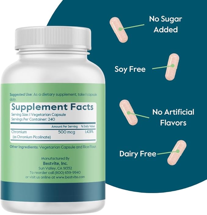 - PURE FORMULA: Bestvite Chromium Picolinate contains no stearates, is non-GMO, gluten-free, and vegan. Each capsule contains 500mcg of Chromium Picolinate.