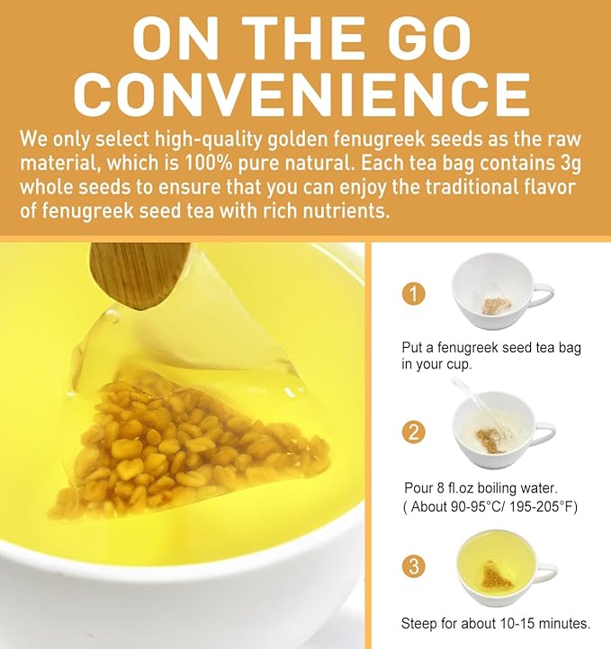- PREMIUM INGREDIENTS: We select high-quality golden fenugreek seeds as the raw material, which is pure natural without any artificial additives. Each teabag contains 3g whole seeds to ensure the traditional flavor of fenugreek seed tea with rich nutrients;