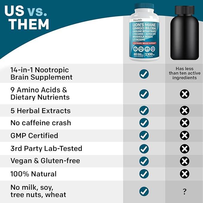 14-in-1 Lions Mane Supplement Capsules - Nootropic Brain Supplement with Ginkgo Biloba for Brain Support, Memory and Focus - Alpha GPC, L Theanine & Choline Supplements with 1300mg Per Serving (60 ct)