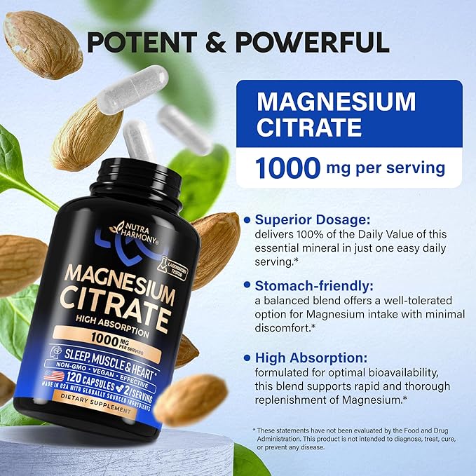 - Magnesium Citrate 1000mg — Elevate your wellness journey with our premium Magnesium Citrate 1000mg capsules! Packed with the power of Magnesium, NUTRAHARMONY’s potent source of this essential mineral is meticulously formulated to support your overall health and vitality. From promoting relaxation to aiding muscle recovery, our formula is designed to help you thrive daily!