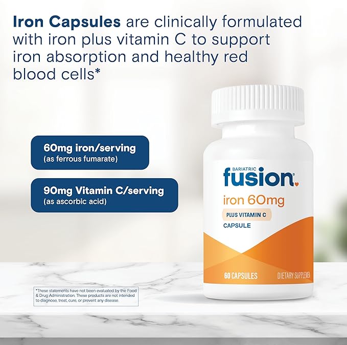 - Bariatric Formulation: Bariatric Fusion Bariatric 60mg Iron Plus Vitamin C Capsules are an easy, affordable, and convenient way for bariatric surgery patients to meet their daily iron requirements. With just 1 capsule daily, this formula provides well-tolerated and bioavailable ferrous fumarate iron with vitamin C to support iron absorption.*