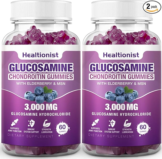 - Advanced Formulation: Healtionist glucosamine chondroitin gummy containing 3000mg glucosamine hydrochloride, 200mg chondroitin sulfate sodium, 200mg turmeric extract, 3.3mg hyaluronic acid, 216mg calcium fructoborate, 1000mg MSM, 200mg elderberry extract are an easy to take gummy suitable for women, men, adults and children. They do not raise blood sugar levels and are pectin based. You can incorporate them into your daily routine without feeling guilty or affecting your dietary preferences.