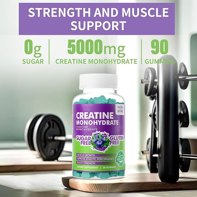novomins Creatine Monohydrate Gummies 5000mg for Men & Women, Chewables Creatine Monohydrate for Muscle Strength, Muscle Builder, Energy Boost, Pre-Workout Supplement(90 Count)-Blueberry Flavor.