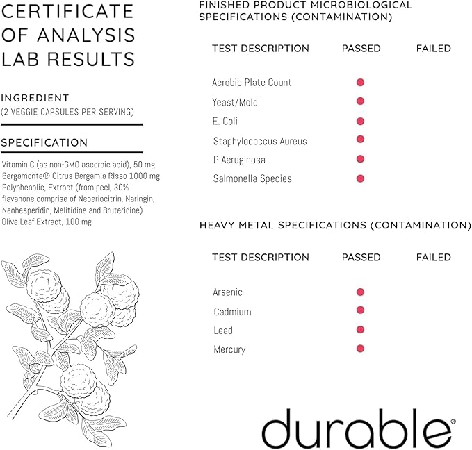 Durable Heart ā Bergamonte Citrus Bergamot 1,000 mg + Olive Leaf Extract + Vitamin C - Heart Health Supplement for Healthy Cholesterol - Doctor Formulated, Vegan, Non-GMO, Made in USA (180 Capsules)