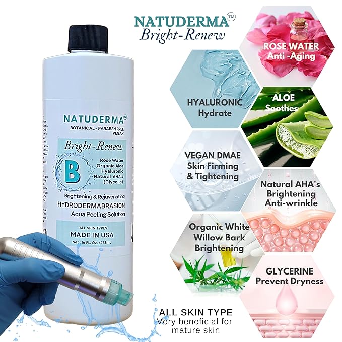 - Proudly MADE IN THE USA - PARABEN FREE. Natuderma Bright-Renew Hydro dermabrasion solution & the Super Vitamin C Serum are made in the USA with natural ingredients, paraben free, phthalate free, vegan, no animal testing.