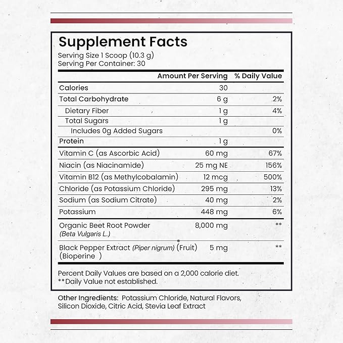 - Primary Supplement Type : Niacin (Vitamin B3), Organic Beet Root Powder, Potassium, Vitamin B12 (Methylcobalamin), Vitamin C (Ascorbic Acid) Niacin (Vitamin B3), Organic Beet Root Powder, Potassium, Vitamin B12 (Methylcobalamin), Vitamin C (Ascorbic Acid)