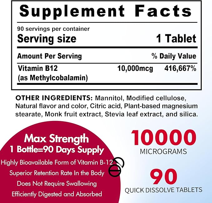 - Quality Guarantee: Manufactured with superior nutrition & formulation - The goal of ours is to promote optimal health with high-quality, effective, affordable, and superior formulation of dietary supplements. Our customers can be assured of purity, value, and potency. These B12 tablets with unique delivery method will help your mind and body get extra energy, and improves concentration, focusclarity, and cognitive function.