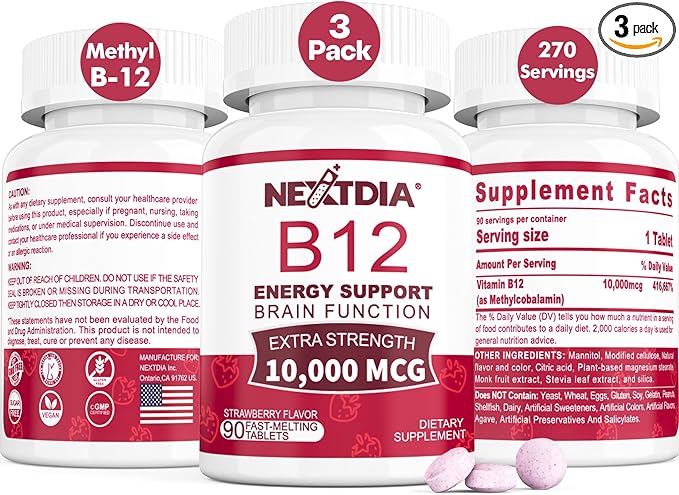 - Sugar Free & Delicious: Nextdia offers smooth strawberry-flavored chewable vitamin B12 5000mcg tablets. A pleasant taste from natural sweeteners mannitol and stevia, the small one-a-day tablets dissolve comfortably under the tongue. Our vitamins B12 supplement has no color added, no artificial flavors and no preservatives are packed with natural flavors that are Vegan, non-GMO, and contain no gluten, dairy, soy, egg, fish, shellfish, tree nuts, or peanuts ingredients and completely fabulous vegan vitamin B12!
