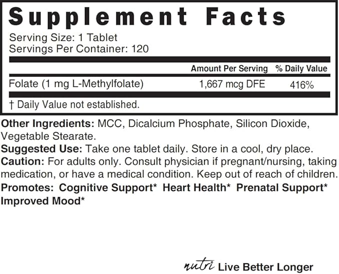 Nature's Fusions Nutri 5-MTHF L Methylfolate 1MG - 4 Month Supply, 120 Vegan Tablets - Methylated Folate Supplement - Cognitive Function, Heart Health, Prenatal Support - Methylated Folic Acid