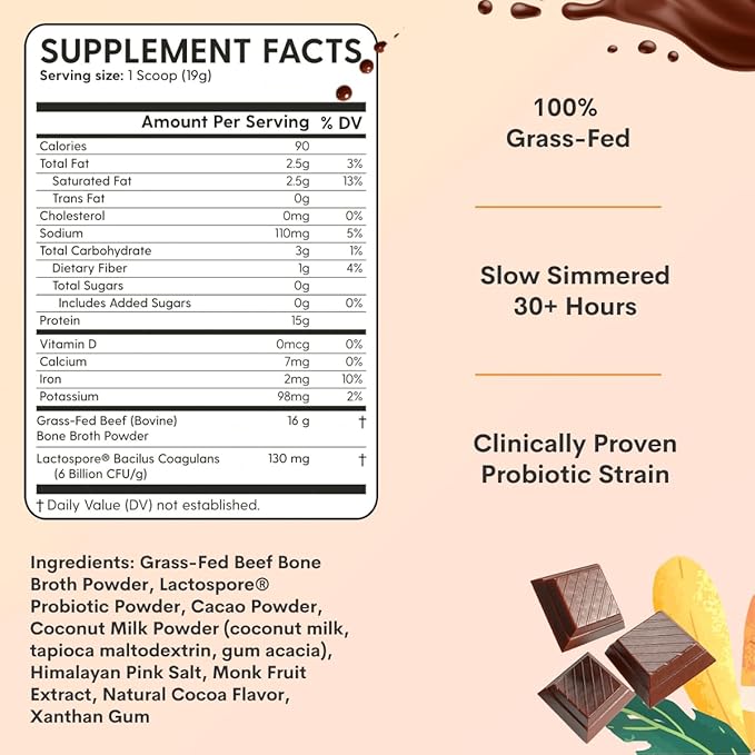 100% Grass-Fed Chocolate Bone Broth Protein Powder with Probiotics – Zero Artificial Flavors, 15g Protein, Collagen-Rich, Gut & Joint Support, Healthy Hot Chocolate, Keto, Paleo, Gluten Free