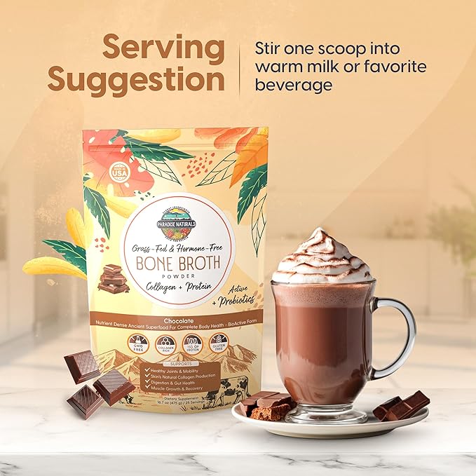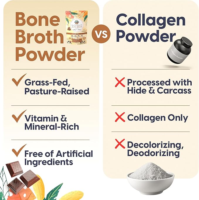 - DIGESTION, SKIN, GUT, & JOINT HEALTH: Our bone broth is rich in protein, collagen, and amino acids, which are essential nutrients in our bone broth diet. It can help to reduce cravings, support healthy skin, gut, and joint health.