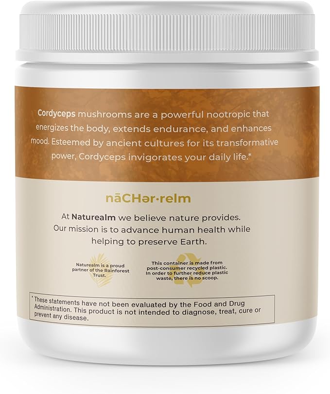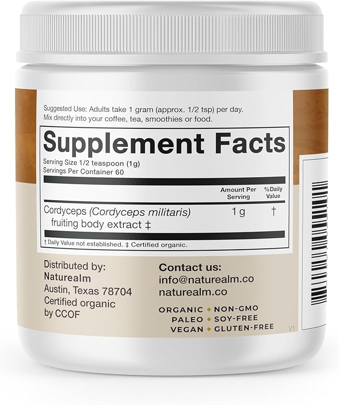 Naturealm Cordyceps Mushroom Powder - Organic Mushroom Extract for Focus, Energy & Mental Clarity - 100% Mushroom Fruiting Bodies - Cordyceps Militaris Supplement (60 Servings)