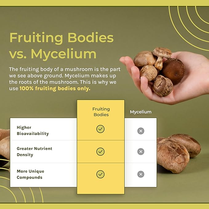 - ā PREMIUM QUALITY NATURAL INGREDIENTS Powder made from 100% fruiting bodies, not mycelium on grain ā No fillers, additives, or stimulants ā Certified organic, vegan-friendly & gluten-free formula ā Laboratory tested for purity and potency.
