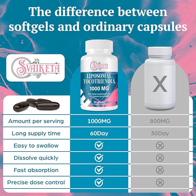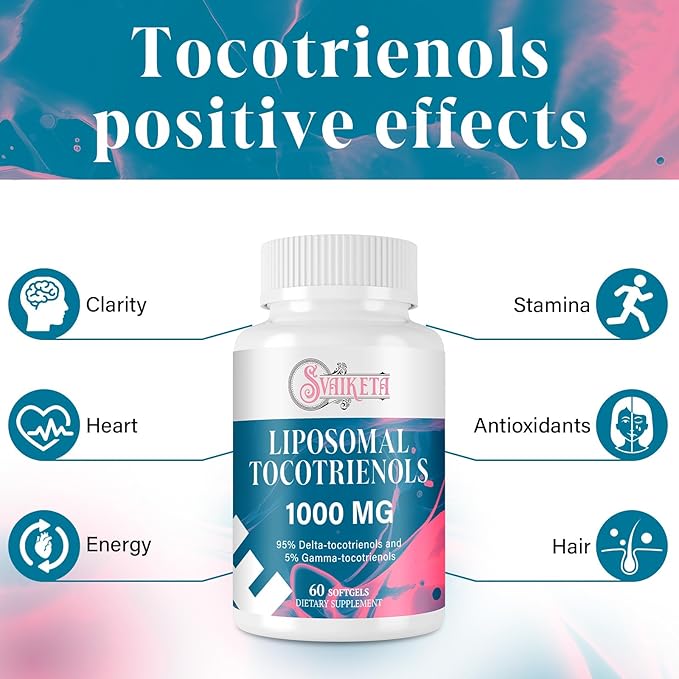 Liposomal Tocotrienols 1000mg – High Absorption Vitamin E Tocotrienols Supplement with 95% Delta & 5% Gamma – Antioxidant for Skin & Healthy Aging – 60 Softgels