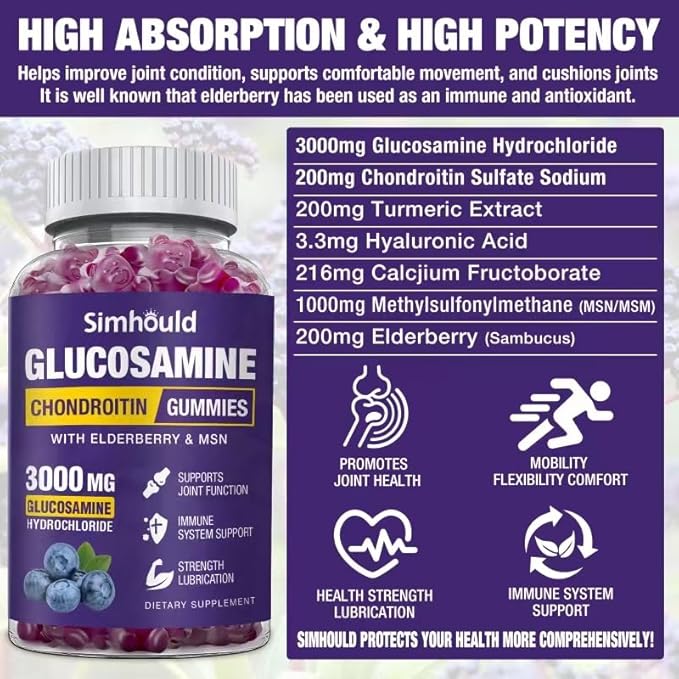 - [ Support Joints Healthy ]: Glucosamine chondroitin is an important chondrotrophic nutrient that has been shown to support joint cartilage repair. At the same time, MSM can reduce joint discomfort and support healthy joints. Simhould glucosamine chondroitin gummy can repair damaged joints, increase synovial fluid accumulation, and provide shock-absorbing protection.