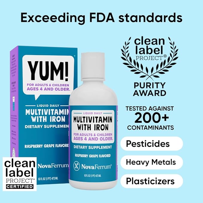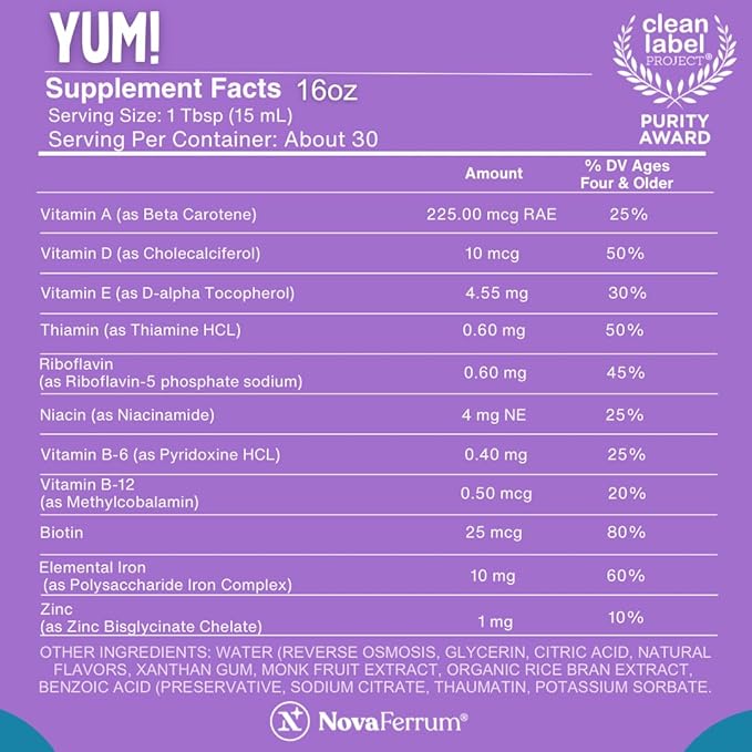 NovaFerrum Yum 16 Fl Oz | Multivitamin with Iron for Ages 4 & Up | Gluten Free Certified | Sugar Free | Raspberry Grape
