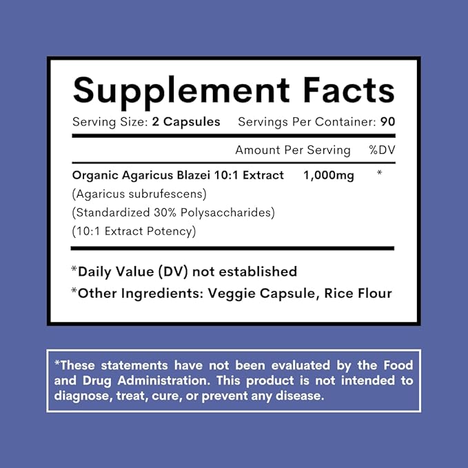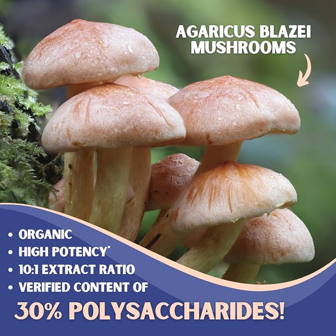- ABOUT OUR AGARICUS BLAZEI CAPSULES — With a massive herbal concentration of Agaricus Blazei Mushroom per serving, our Organic Agaricus Blazei Mushroom Capsules are made with a nutritious and potent 10:1 Mushroom Extract standardized with 30% Polysaccharides. They come in small veggie capsules that are extremely convenient to implement into everyday health routines, and are specially made to support and optimize one's energy production, immune system, digestive health, and wellness.*