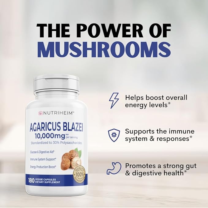 Agaricus Blazei Organic Mushroom Extract for Immune & Energy Support - 30% Polysaccharides & 180 Veggie Capsules - Non-GMO, Gluten-Free, Vegan-Friendly Supplement