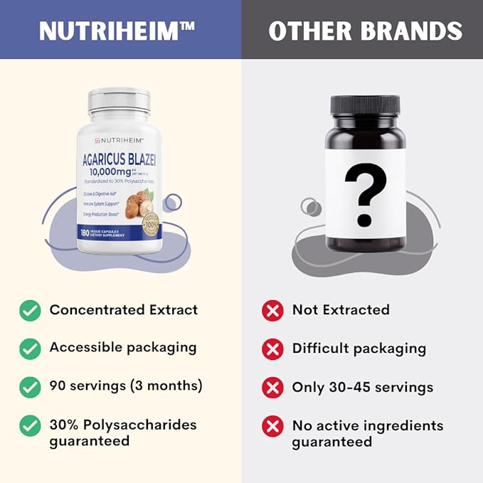 - NON-GMO & GLUTEN-FREE — Our Organic Agaricus Blazei Mushroom Extract Capsule Supplement utilizes ingredients that are classified as Non-GMO, Gluten-free, Dairy-free, and Vegan-friendly, which makes it suitable for a wider range of dietary needs and requirements.