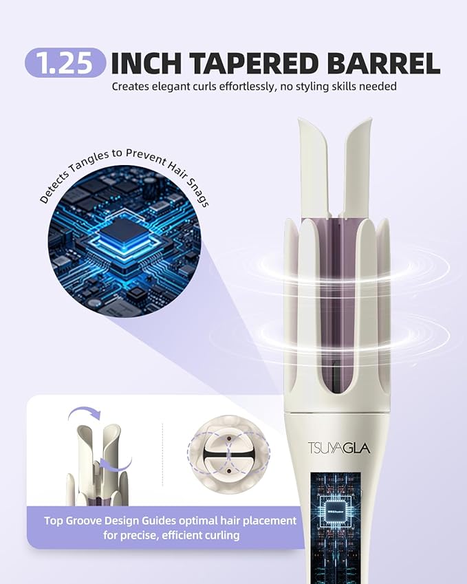- [Anti-Scald & Anti-Tangle] This rotating curling iron features a cool-touch 360° anti-scald design, making it safe even for beginners. Its smart anti-tangle mechanism detects and quickly resolves knots, ensuring a smooth styling experience. This hair curling iron also features a 30-minute automatic shut-off function to prevent fires and protect your life and property.