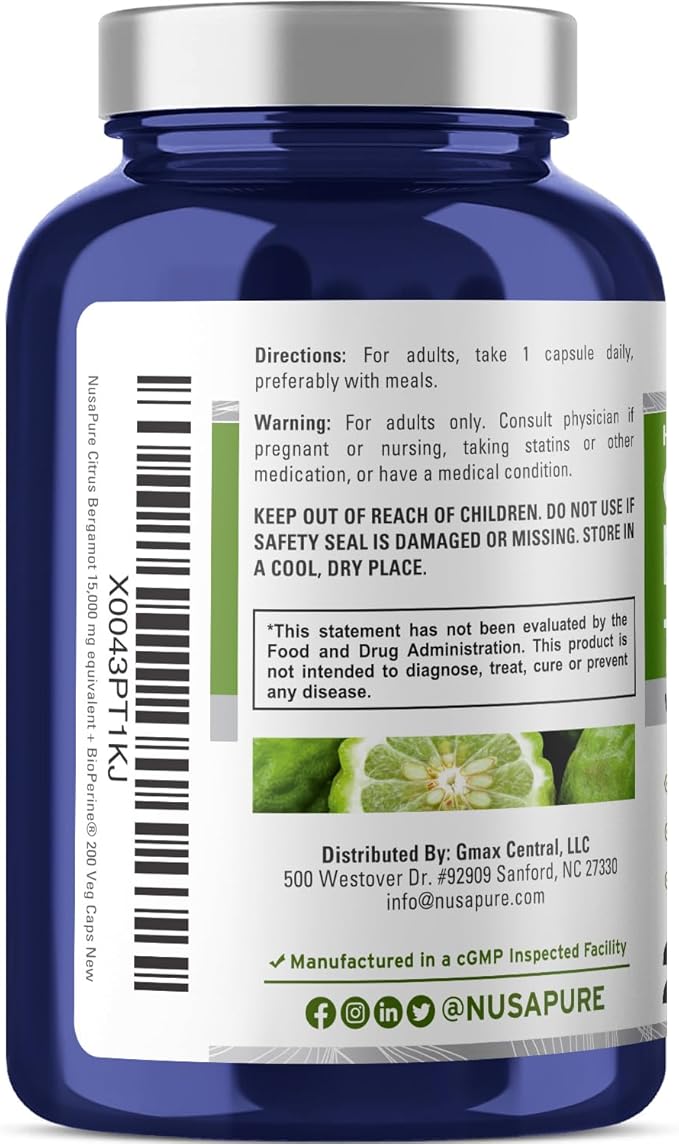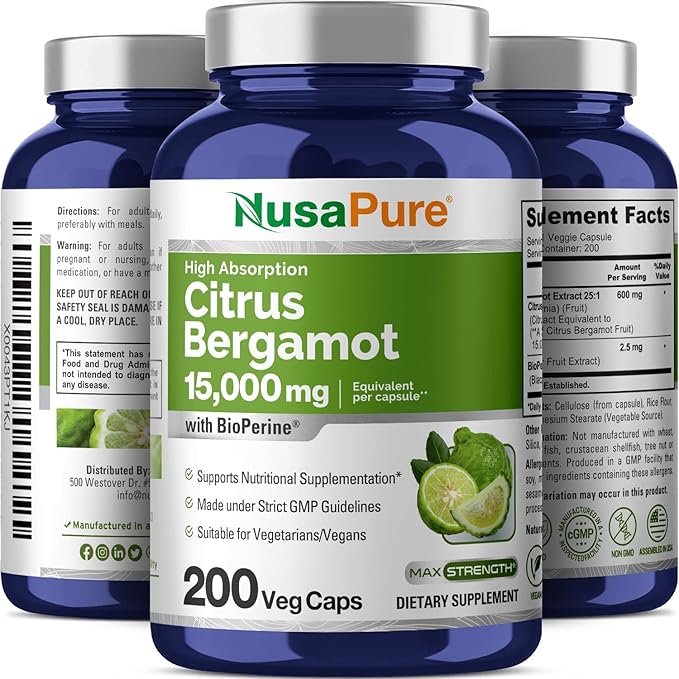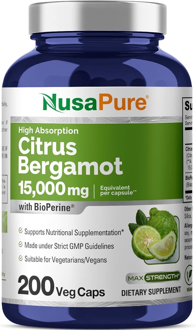 NusaPure Citrus Bergamot Capsules 15,000mg, 200 Capsules - 25:1 Bergamot Extract - 200 Servings, Bioperine, Vegan, Non-GMO