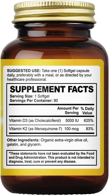 - SUPPORTS CARDIOVASCULAR WELLNESS – Vitamin D3K2 supplement with 5000 IU of D3 and 100mcg of MK-7 K2 helps direct calcium away from soft tissues and into bones. Vitamin K2 supports proper calcium balance, making it a vital part of your daily vitamin routine for overall wellness.