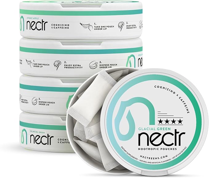Nectr Energy Nootropic Pouches – Glacial Green Wintergreen Caffeine Pouches with Cognizin® Citicoline. Sugar-Free Brain Treats. Smooth, Sustained Focus & Energy Supplement - 5 Pucks of 16pcs