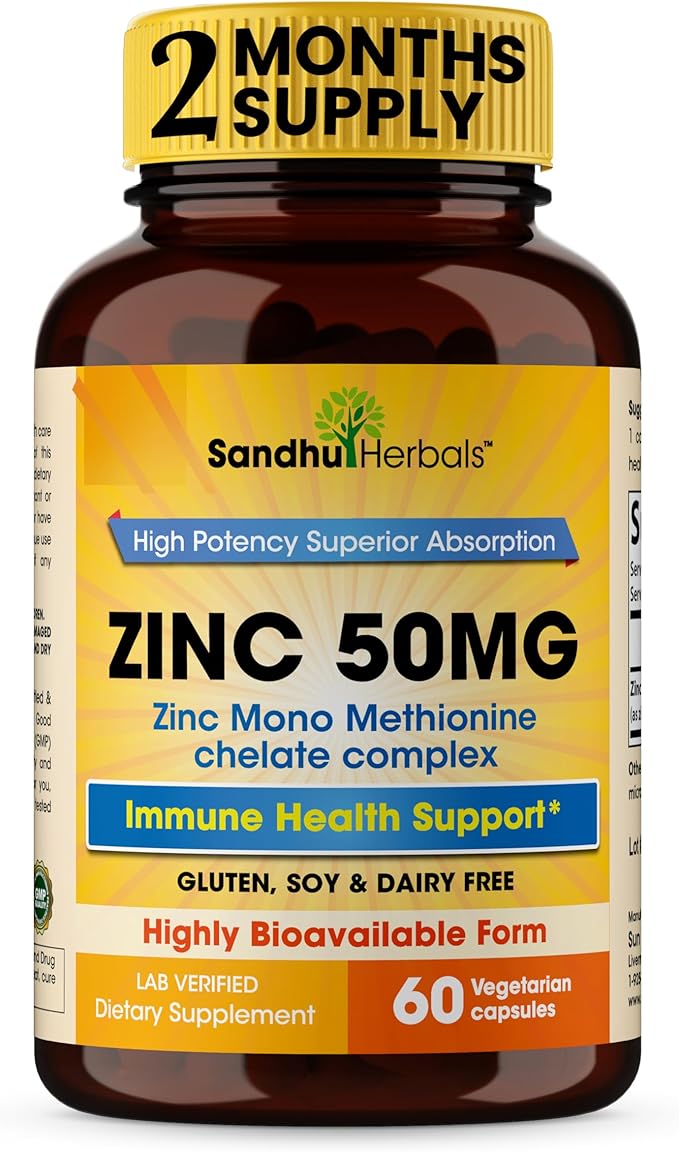 Sandhu Herbals Zinc 50mg Supplement for Men & Women| High Absorption Zinc Monomethionine Complex 60 Capsules| Supplements for Immune, Acne & Antioxidant Support| Vegetarian