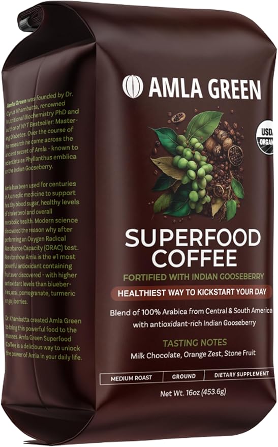 Amla Green Organic Ground Superfood Coffee, Medium Roast Gourmet Coffee with Antioxidant Rich Indian Gooseberry, 100% Arabica Specialty Coffee, 16 Oz