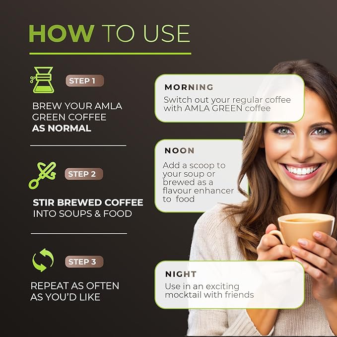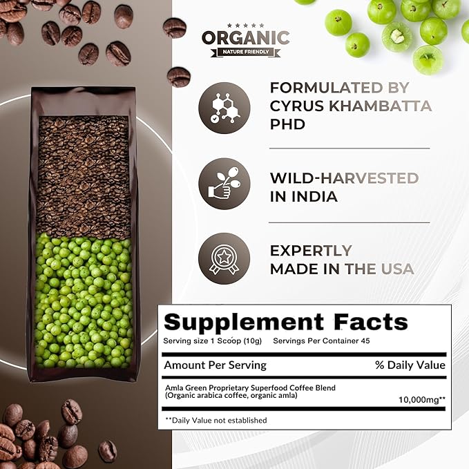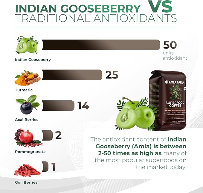- MORNING COFFEE MADE BETTER: Amla-infused 100% Arabica Superfood Coffee, a captivating blend of meticulously sourced beans from Central and South America, infused with the world's most powerful antioxidant—amla. Delight your taste buds with tasting notes of milk chocolate, orange zest, and stone fruit while also nourishing your body with the potent antioxidant properties of amla.