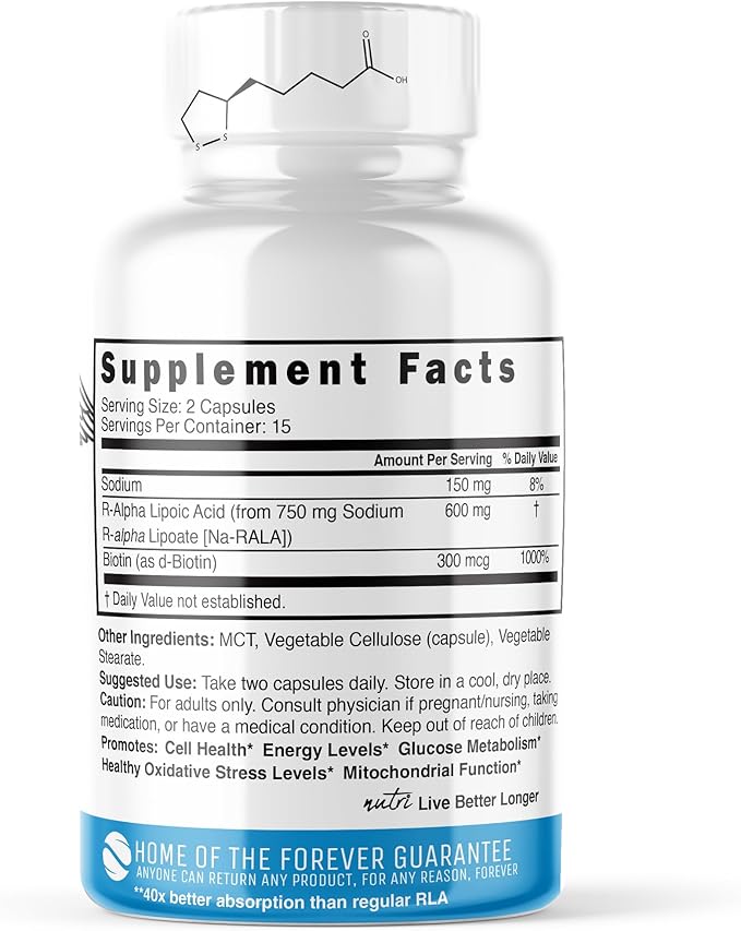 - CELLULAR ENERGY AND METABOLISM SUPPORT: R Lipoic Acid plays a vital role in cellular energy production, converting glucose into usable energy. By supporting optimal mitochondrial function, it helps maintain energy levels throughout the day, promoting vitality and well-being.