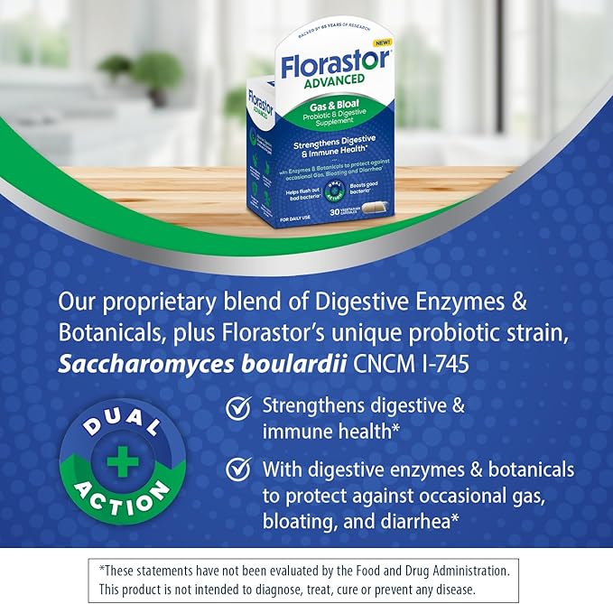 - Our proprietary blend: Florastor's Dual Action Probiotic with digestive enzymes and botanicals to help protect against occasional gas, bloating, and diarrhea; provides bloating relief for women and men.*